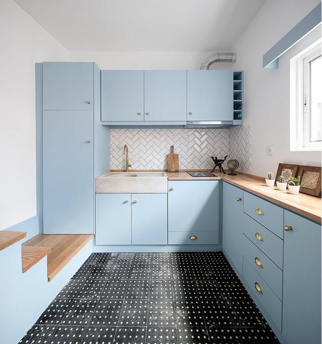 进门跳入眼帘的是L型蓝色厨房,粉蓝色的清新在阳光下格外讨喜,仙气飘飘,撩动少女心,避免粉蓝色太过冷静,特意搭配了温润的木色台面,温情而不失浪漫。