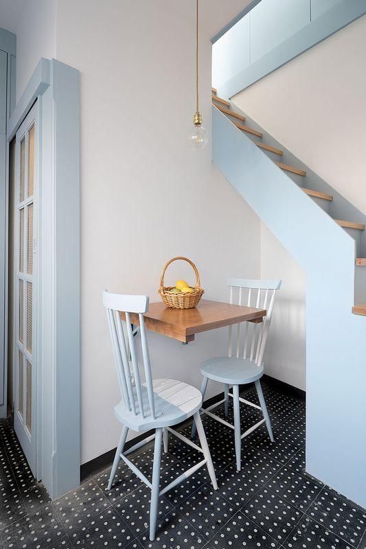 楼梯下是一个可供两人用餐的小区域,虽然有一部分塞进了楼梯下面的凹室,依旧特别温馨。