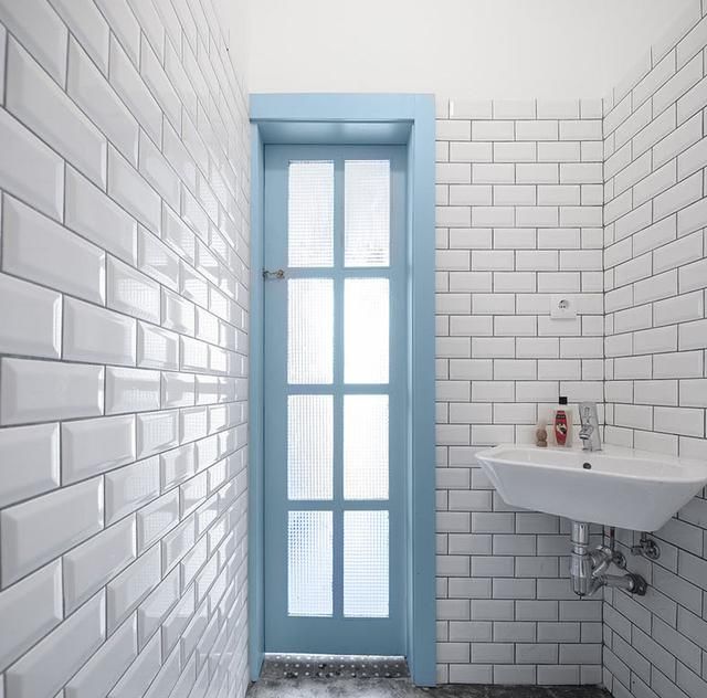 蓝色玻璃栅格门通完浴室,空气中飘来的是清新精致的温柔味道,粉蓝色门和白色方砖,年轻的,充满生命力的展示。