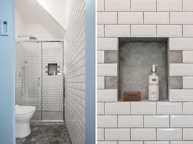 这间小而现代的浴室的特点是浴室里有一个内置的搁板,它被白色的瓷砖包围,利用了空间又干净整洁。小卫浴也有干湿分离,有讲究不将就!